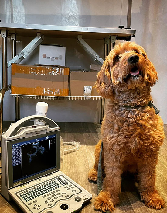 The scans can be carried out standing or lying down, whichever is more comfortable for your dog and we use a use a water-based gel that is safe to use on the dog’s abdomen.
